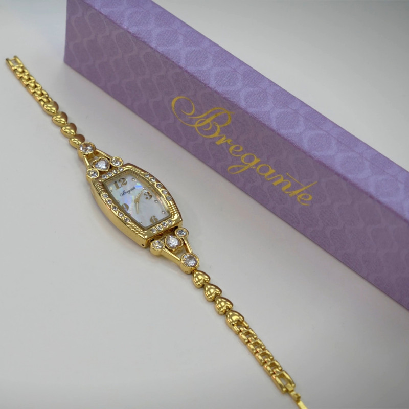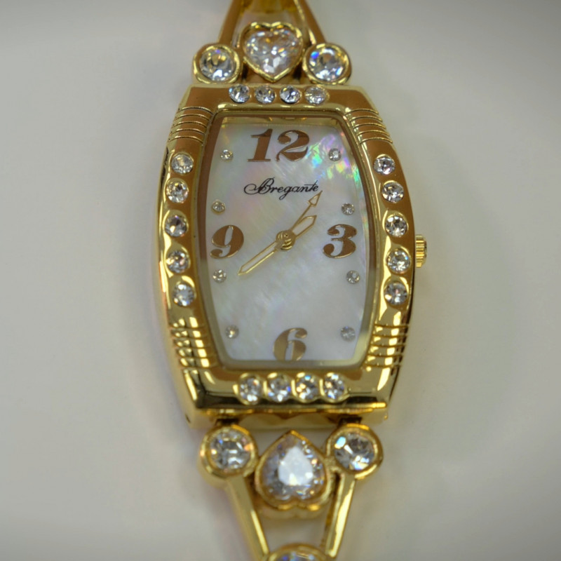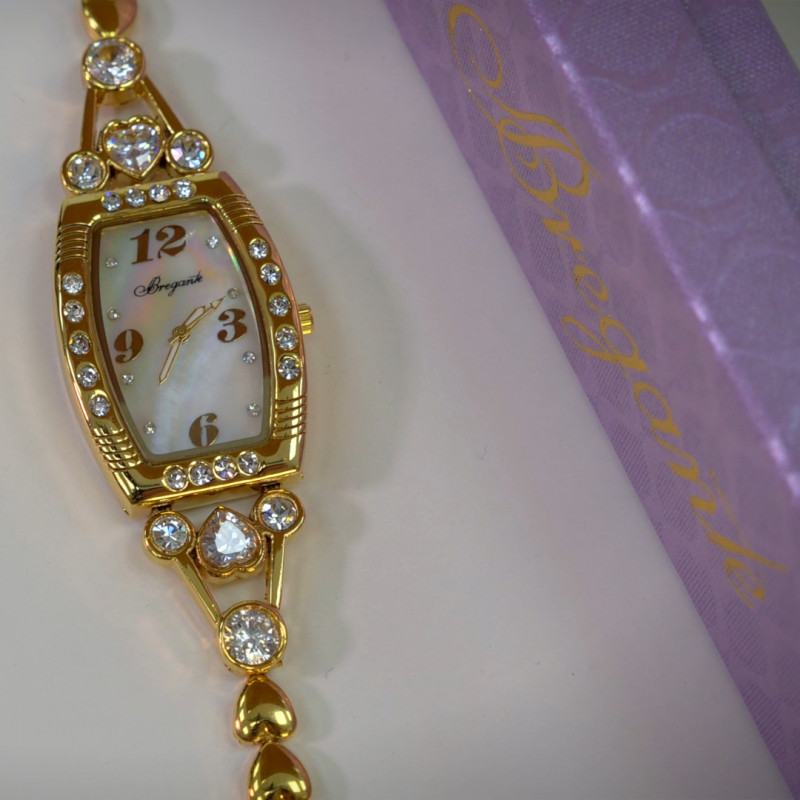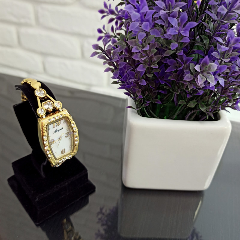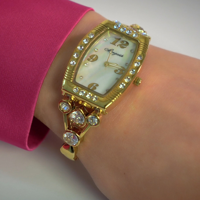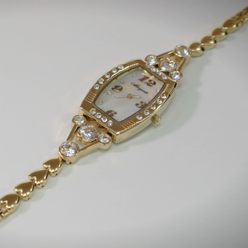 Выполнены часы из современного бижутерного сплава с шестислойным ЗОЛОТЫМ покрытием и украшены сияющими кристаллами бриллиантовой огранки! А циферблат покрыт нежным перламутром!