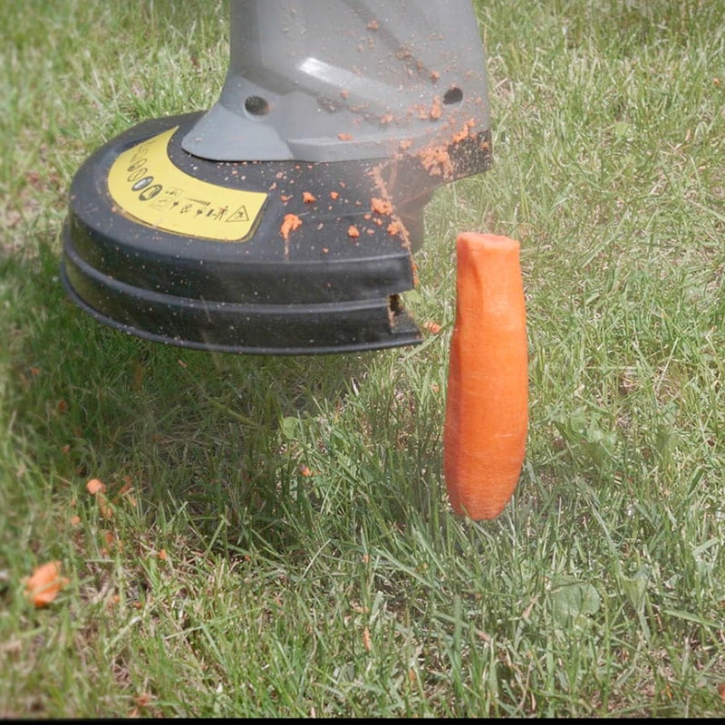 Але це не все! Ви тільки подивіться на скільки тример Корс потужний! Як він блискавично перерубує моркву! А це означає, що наш триммер впорається навіть з найтовщим бур'яном!