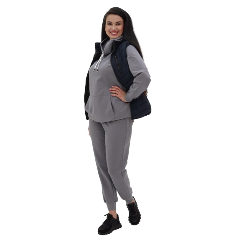 Костюм Магда створений спеціально для стильних і успішних жінок, які цінують комфорт і якість за розумну ціну! Худі і брюки виготовлені з м'якого трикотажу на основі бавовни, підходять для жінок будь-якої комплекції! При цьому матеріал практично не змінюється, не катується і не вигорає після прання! Справжнє скарб, яке послужить вам на довгі роки! А зручний і стильний жилет чудово доповнить ваш образ, забезпечуючи тепло, навіть без необхідності у куртці!
