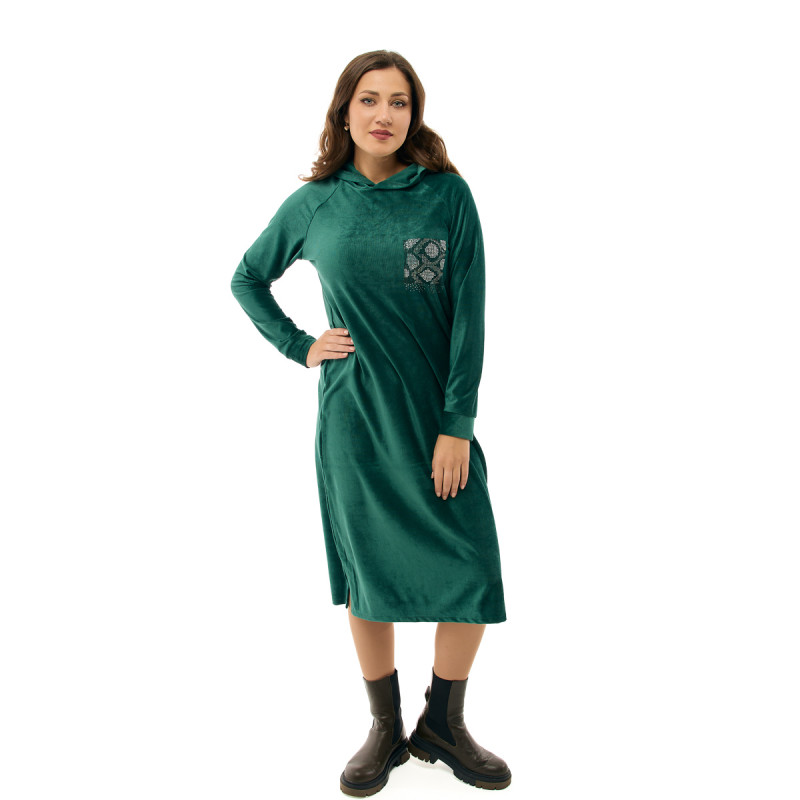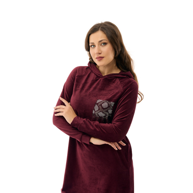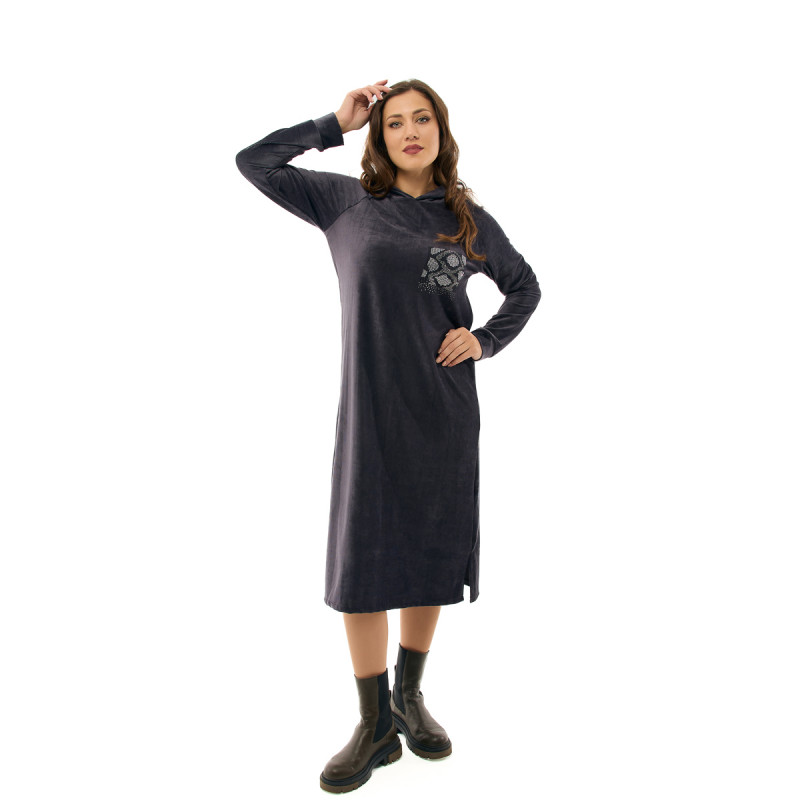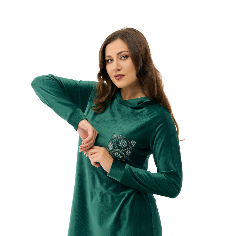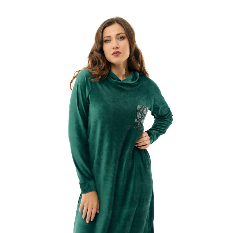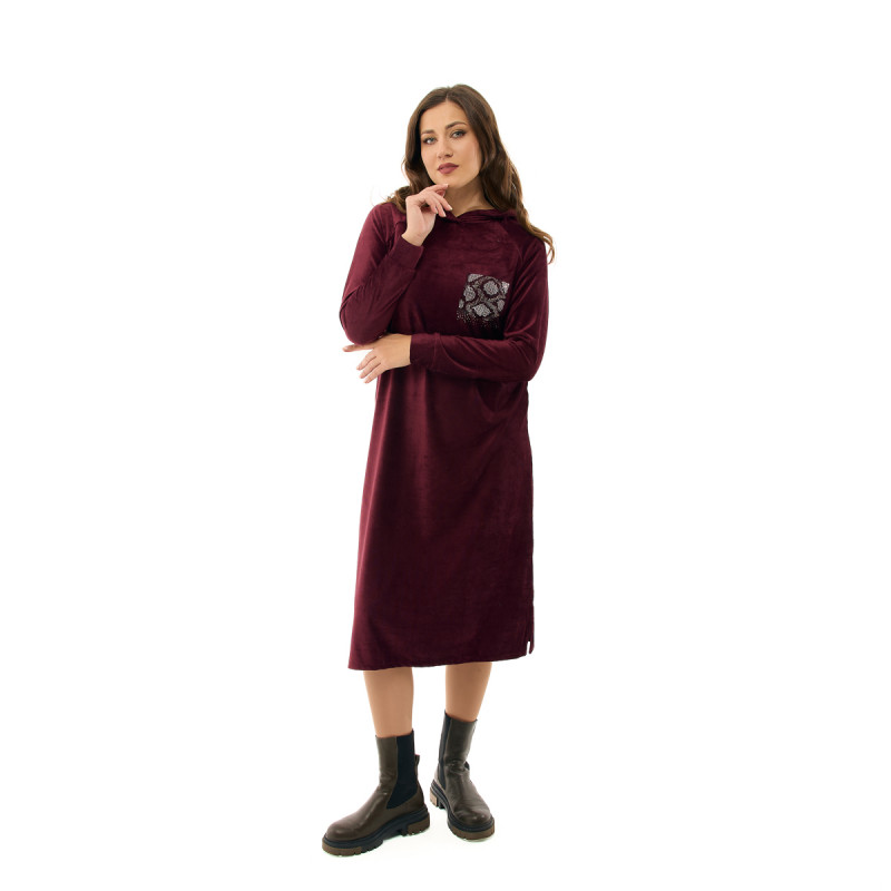 Матеріал сукні - м'який і блискучий велюр, який дарує неймовірне сяйво і комфорт. Він практичний у носінні, зігріває в прохолодні дні і при цьому залишається приємним на дотик. Міді-довжина гармонійно підкреслює жіночність і відповідає модним трендам, а витончені бічні розрізи додають нотку витонченості та шарму. І, звісно, переливчасті стрази - це справжня розкіш, яка зробить ваш образ незабутнім.