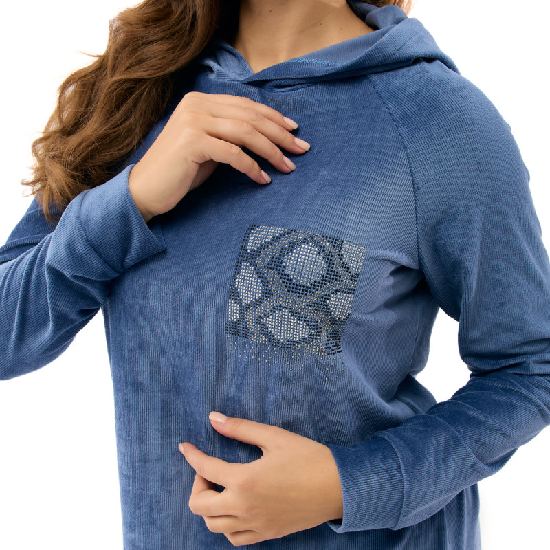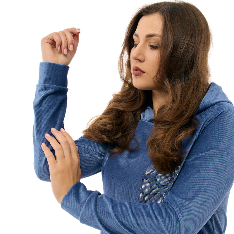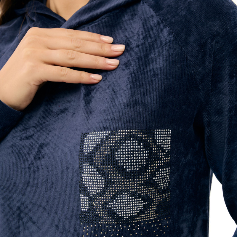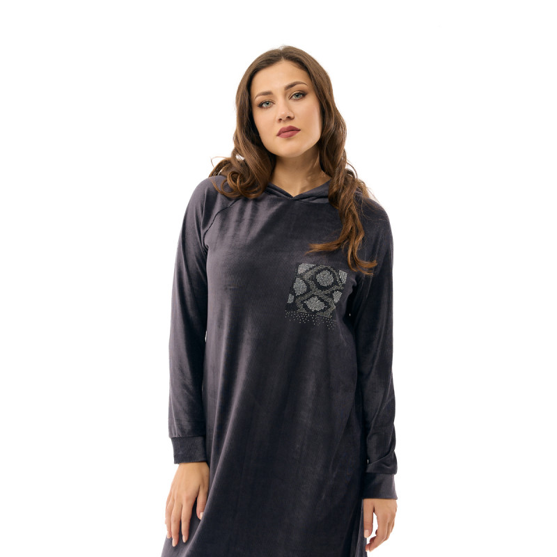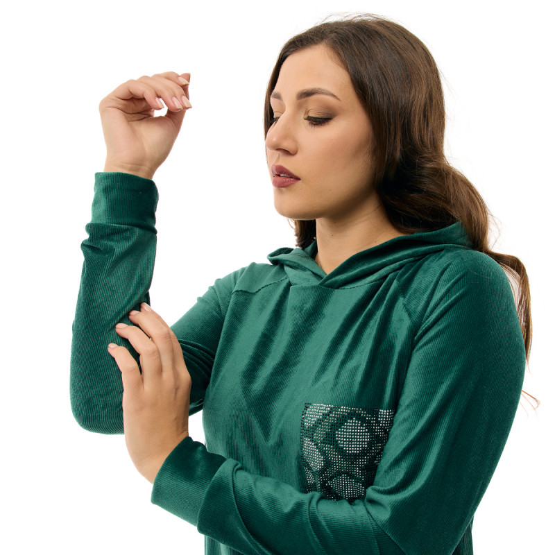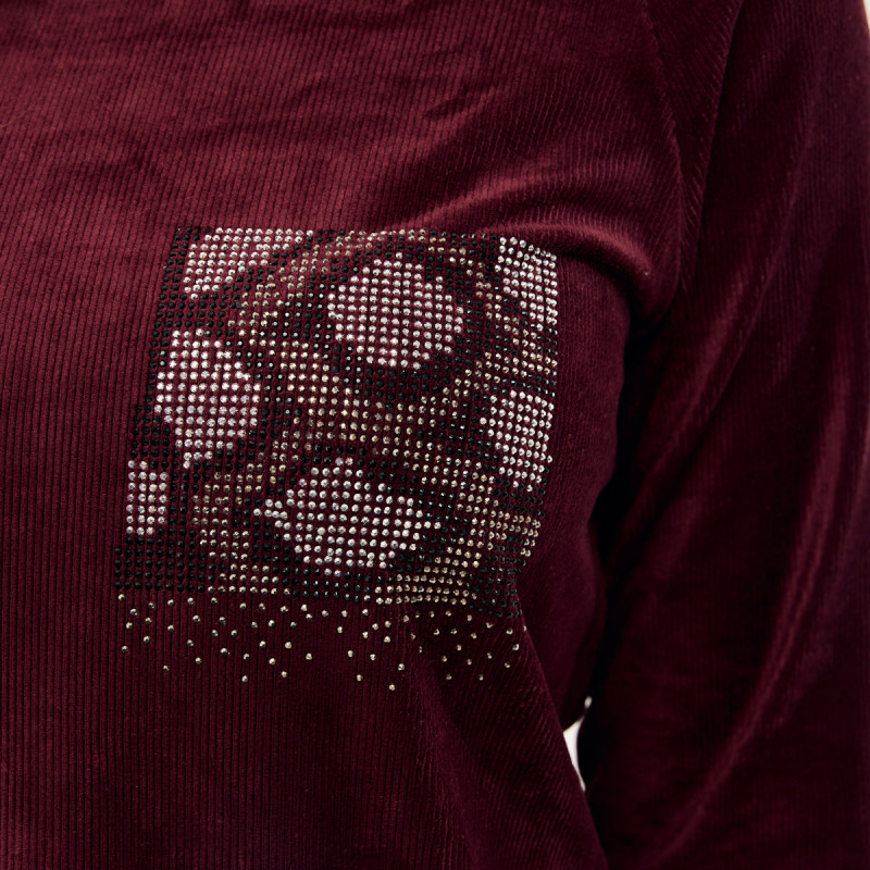 Матеріал сукні - м'який і блискучий велюр, який дарує неймовірне сяйво і комфорт. Він практичний у носінні, зігріває в прохолодні дні і при цьому залишається приємним на дотик. Міді-довжина гармонійно підкреслює жіночність і відповідає модним трендам, а витончені бічні розрізи додають нотку витонченості та шарму. І, звісно, переливчасті стрази - це справжня розкіш, яка зробить ваш образ незабутнім.