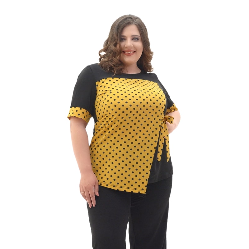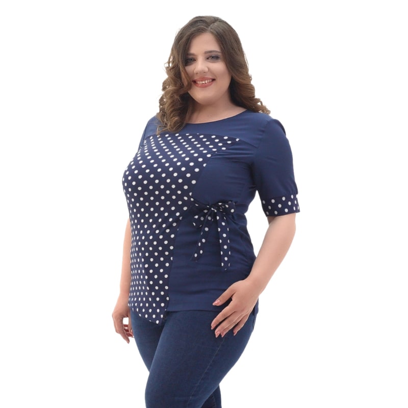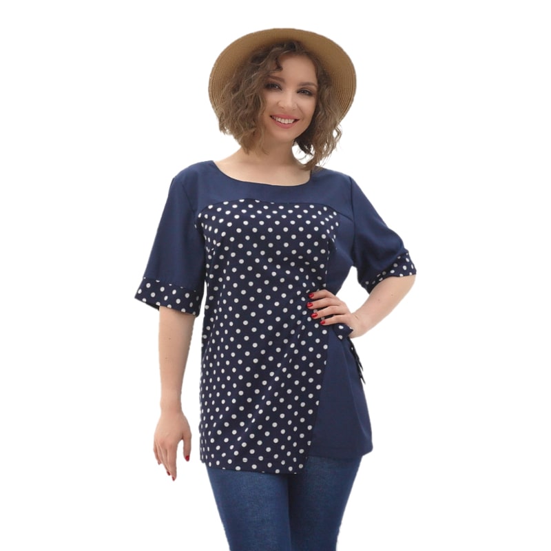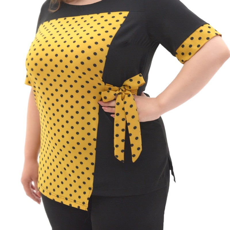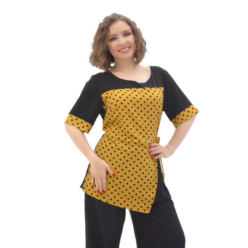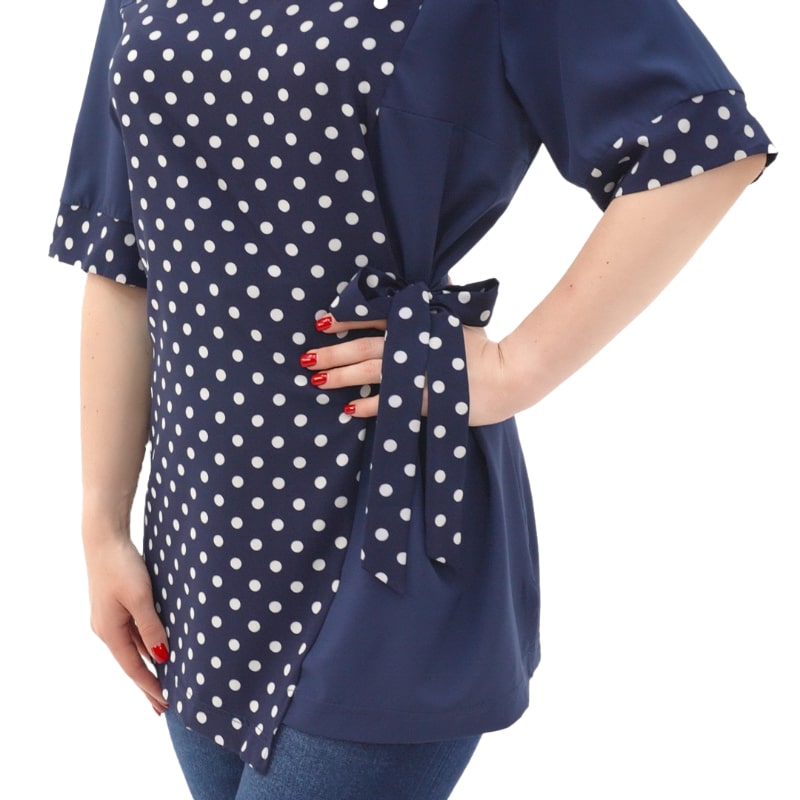 Ви тільки подивіться як жіночно та спокусливо виглядають моделі! Завдяки легкій асиметрії та поєднанню принта горохи та однотонного матеріалу туніка приховує зайві об’єми та візуально зменшує вас на кілька розмірів!