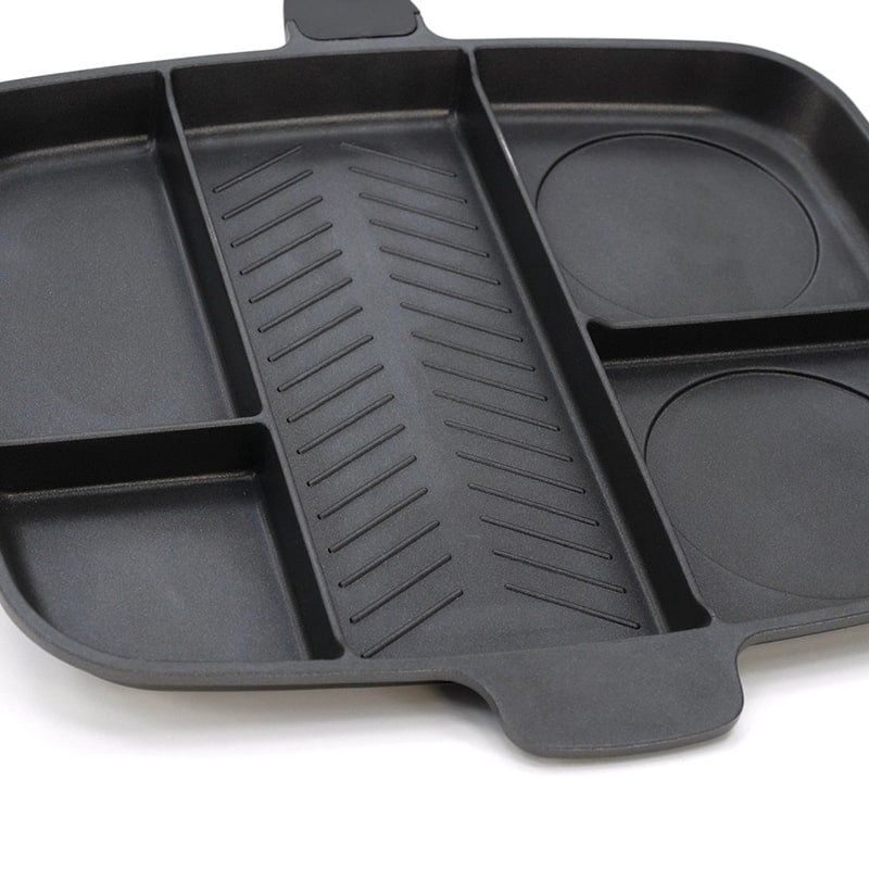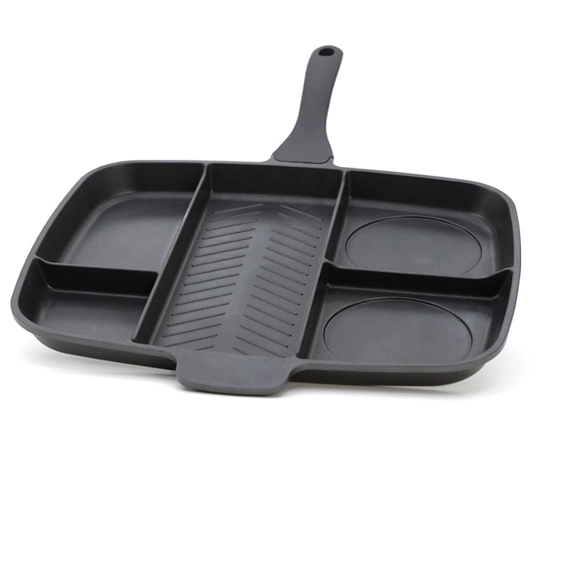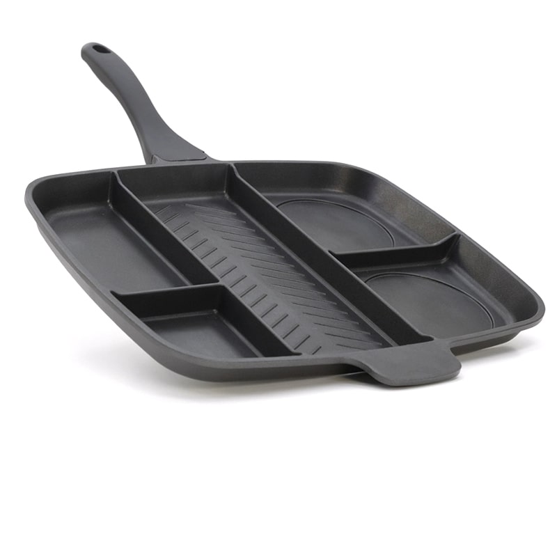 Сковорода Файделайс – це справжня знахідка для господинь! П'ять секцій для п'яти різних страв одночасно! Центральна секція гриль, 2 круглі секції для котлет, яєць або панкейків і ще дві секції для гарнірів та соусів! Дуже зручно та мега швидко!