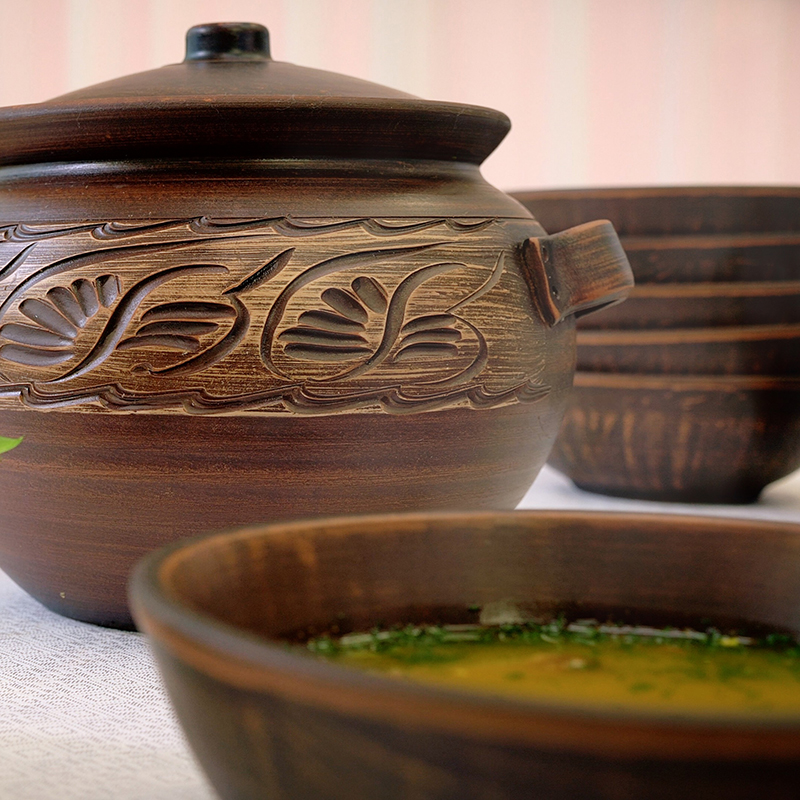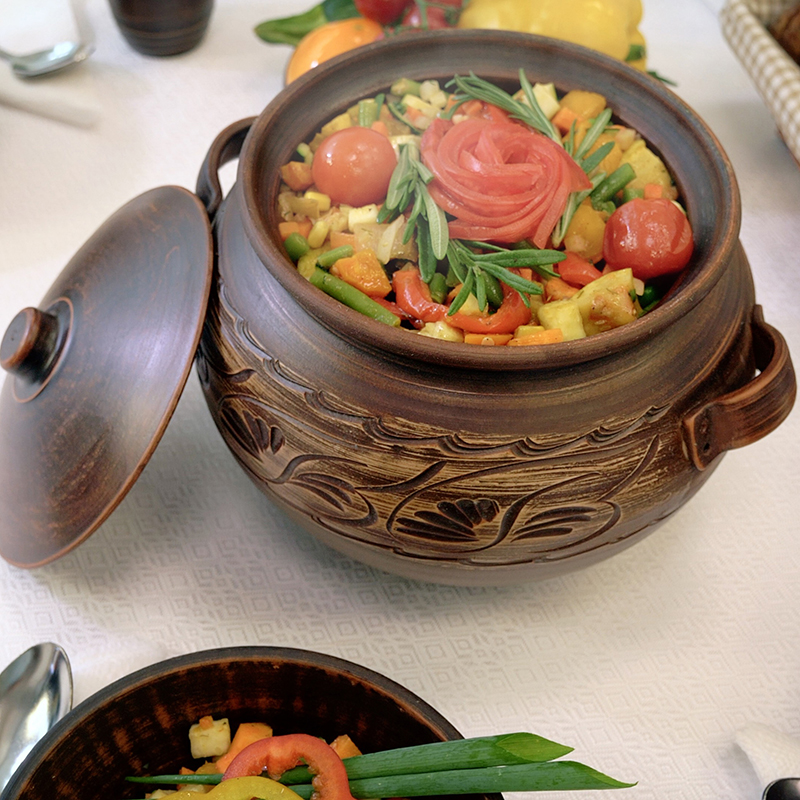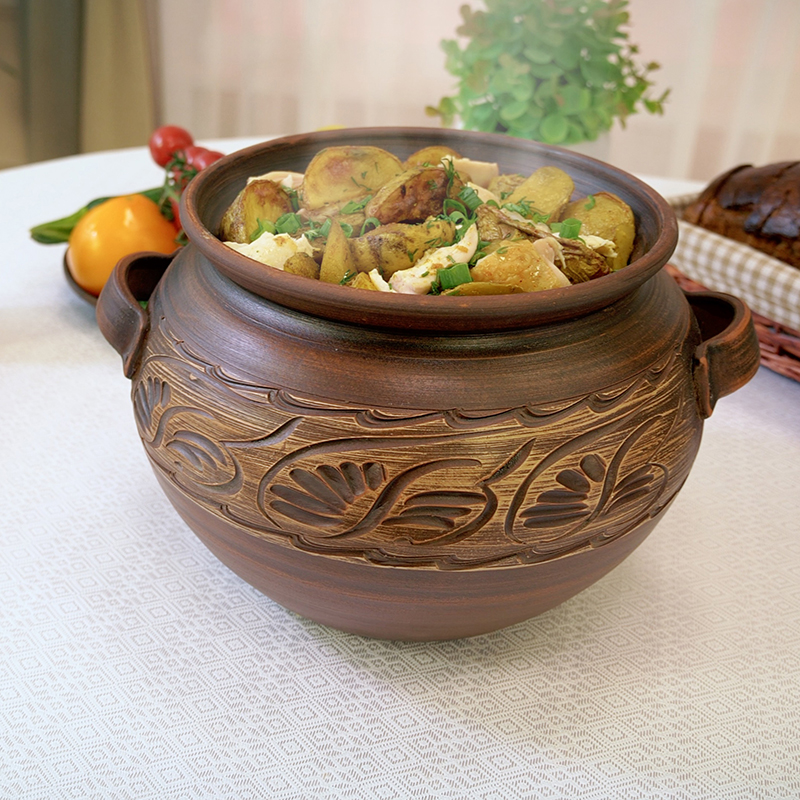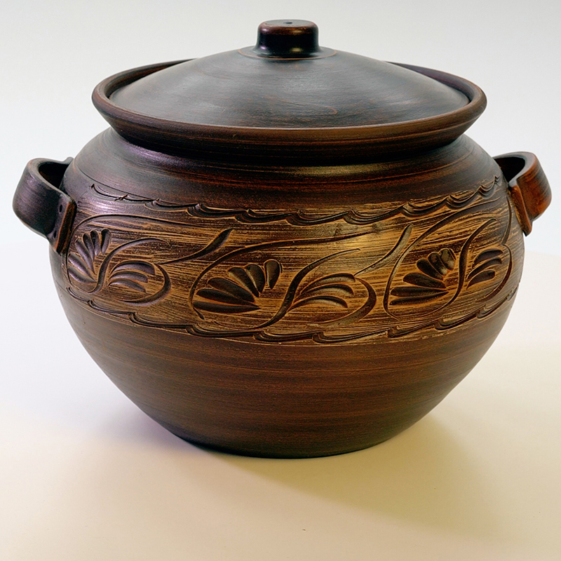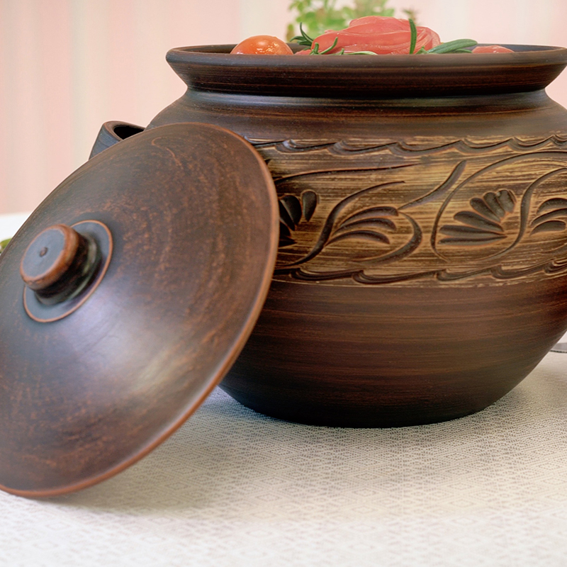 Червона глина і продумана форма забезпечують правильний теплообмін, а також допомагають зберегти корисні властивості продуктів! Жаровня чудово підходить для тушкування або тривалого готування в духовці соковитих овочів, ніжного м'яса і дичини, що тане в роті! Смачно буде як у бабусі! А ще її можна використовувати в мікрохвильовці! Це перевірена роками, практична і зручна у використанні річ! Об’єм 5 літрів дозволить готувати відразу на всю сім'ю! Стильний екодизайн прикрасить будь-яке застілля!
