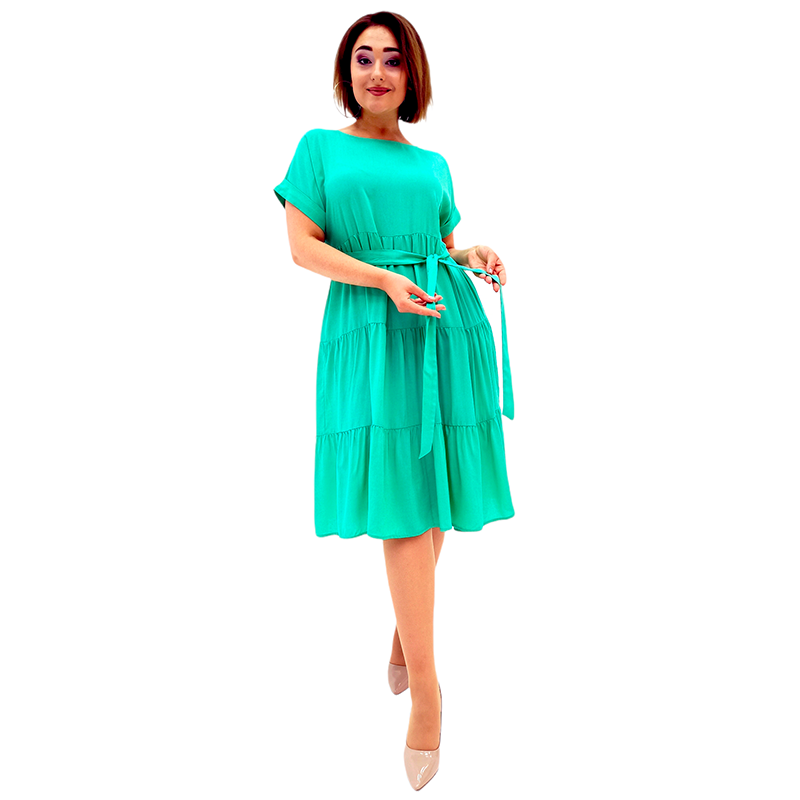 Рукав реглан, знімний пасок і А-подібний силует гарантують відмінну посадку на будь-яку фігуру! При цьому сукня м'яко оформить силует і візуально приховає кілька розмірів! А романтичні волани додадуть ще більше легкості!