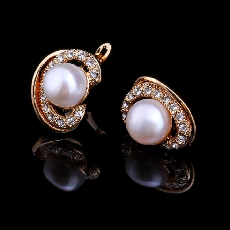 Матовый теплый свет крупной белой жемчужины подсвечивает холодный блеск прозрачных кристаллов. Роскошное украшение для статусных персон. Золотое покрытие, стразы, искусственный жемчуг. Замок-гвоздик Длина изделия--1.8 см, диаметр жемчуга-0.9 см