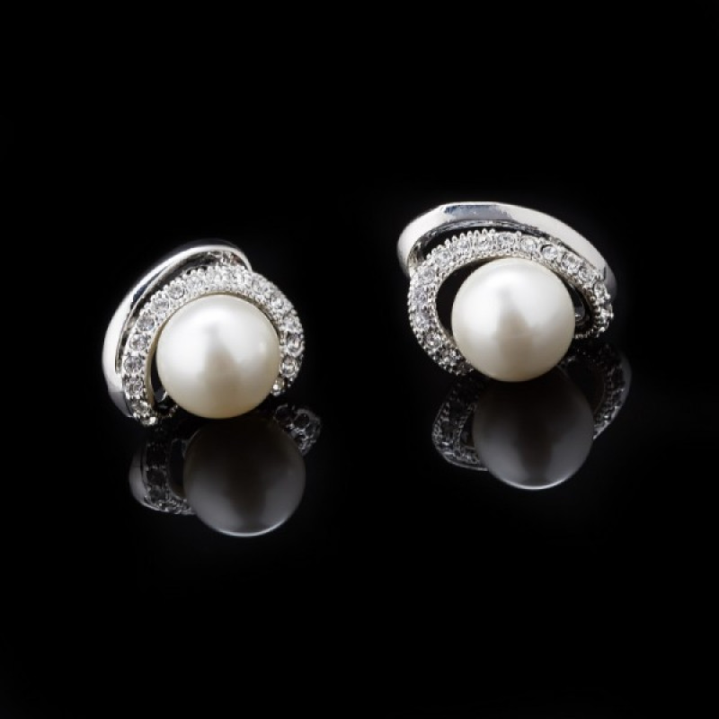 Матовый теплый свет крупной белой жемчужины подсвечивает холодный блеск прозрачных кристаллов. Роскошное украшение для статусных персон. Родиевое покрытие, стразы, искусственный жемчуг. Замок-гвоздик Длина изделия-1.8 см Диаметр жемчуга-0.9 см