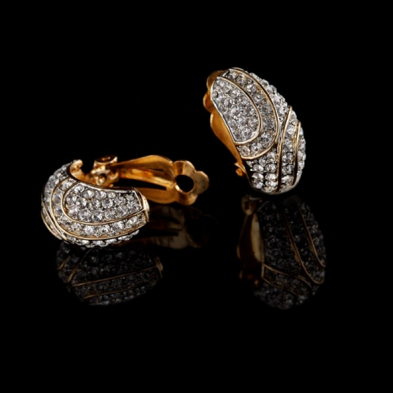 Наполненные формы - мода сезона. Клипсы орнаментированы прозрачными кристаллами и позолоченным орнаментом. Гармоничное сочетание теплых и прохладных тонов. Узор подобен драгоценной коже сказочного дракона. 18 карат золотое покрытие. Серьги с застежкой клипс крепятся даже на непроколотых ушах при помощи защелки пружинного типа. Для фиксирования некоторых изделий предназначены упорные винты, зажимающие мочку с двух сторон. Размер изделия-1.6 см.Ширина декор.элемента-0.7 см.