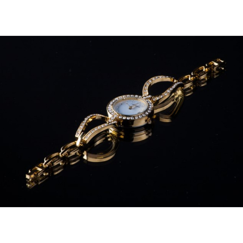 • Россыпь прозрачных камней огранки бриллиант по всему изделию, включая даже циферблат;